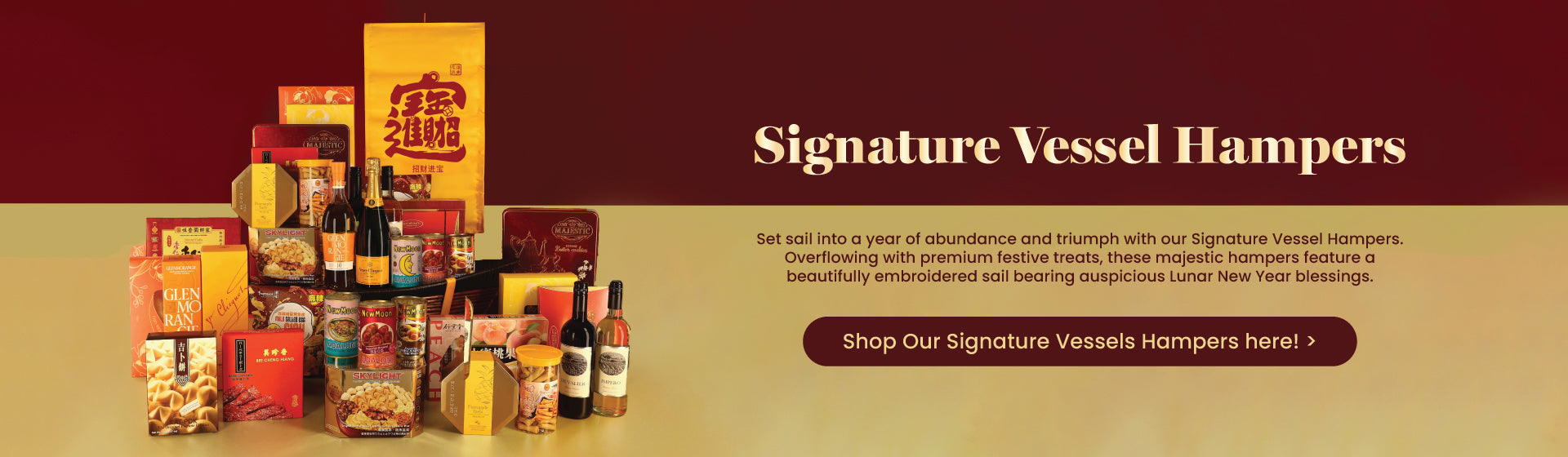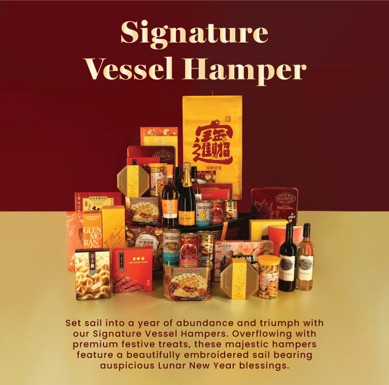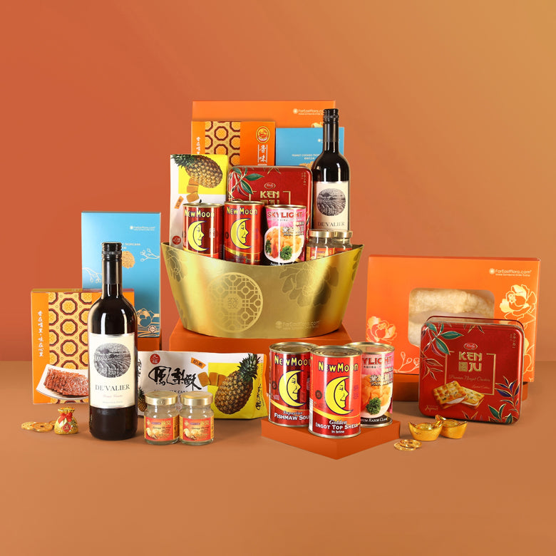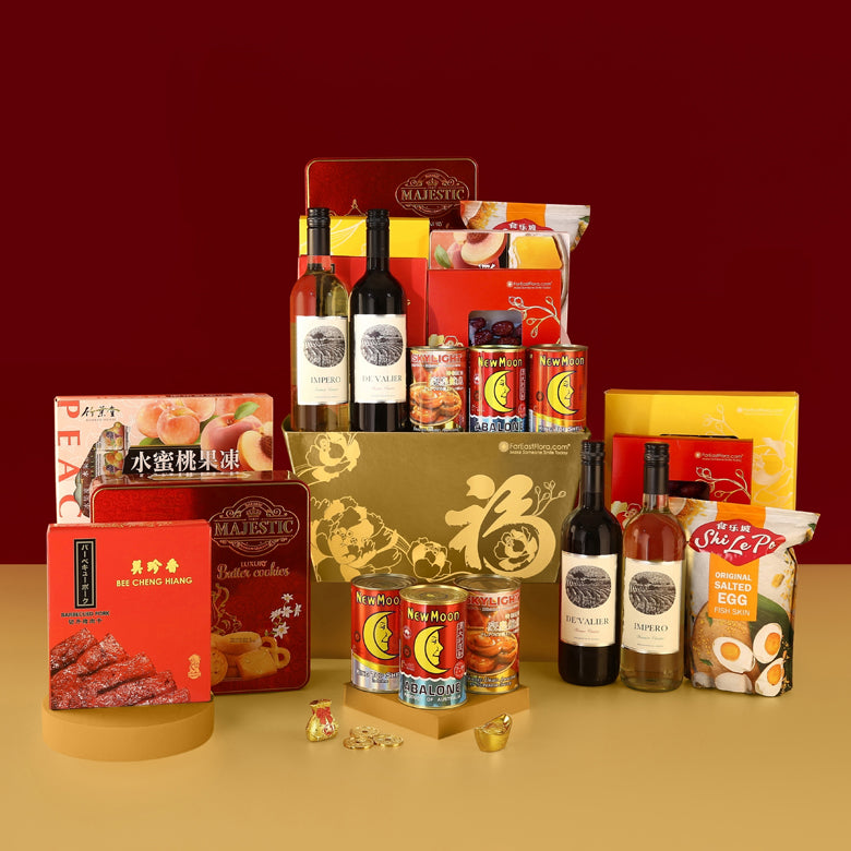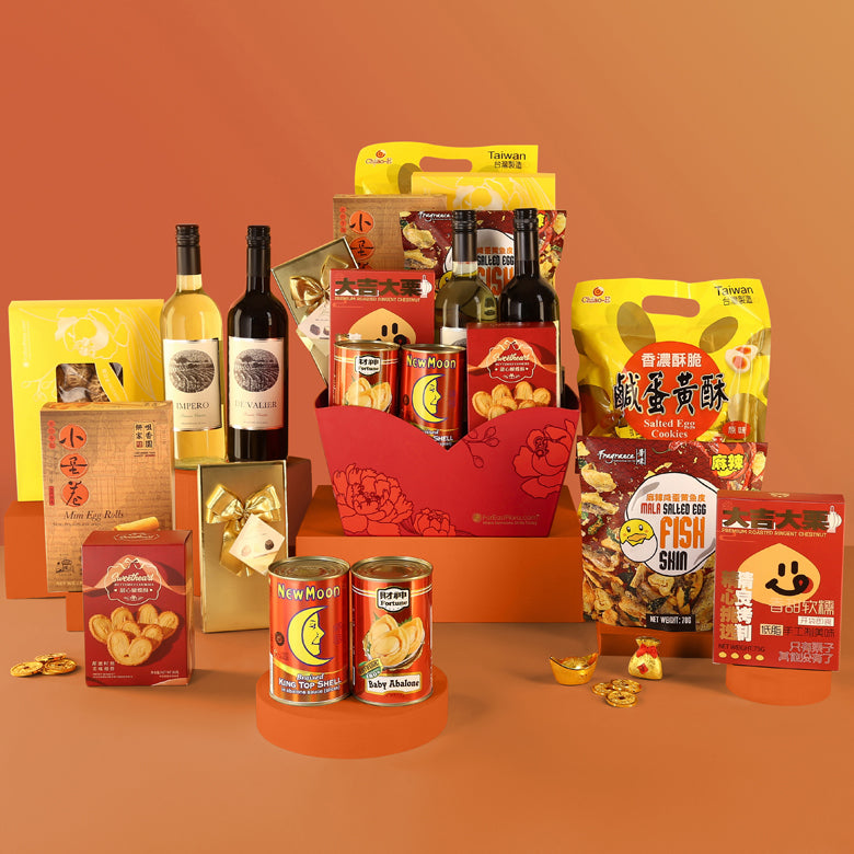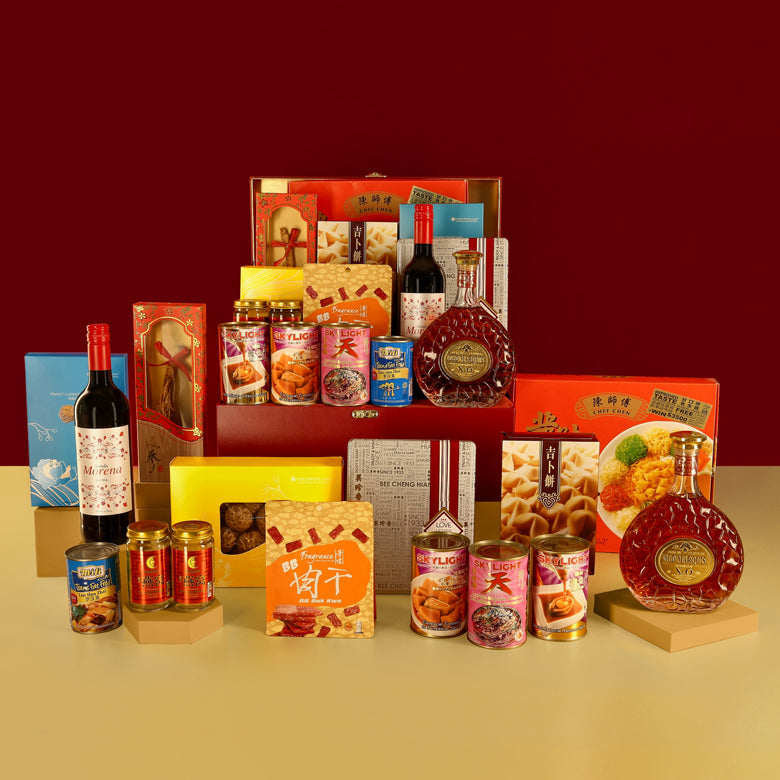 Delight your loved ones with our supreme abundance hampers, featuring an impressive assortment of premium snacks, gourmet delicacies and festive wines. The rich gold accents of the packaging embody the auspicious wishes of a prosperous year ahead.