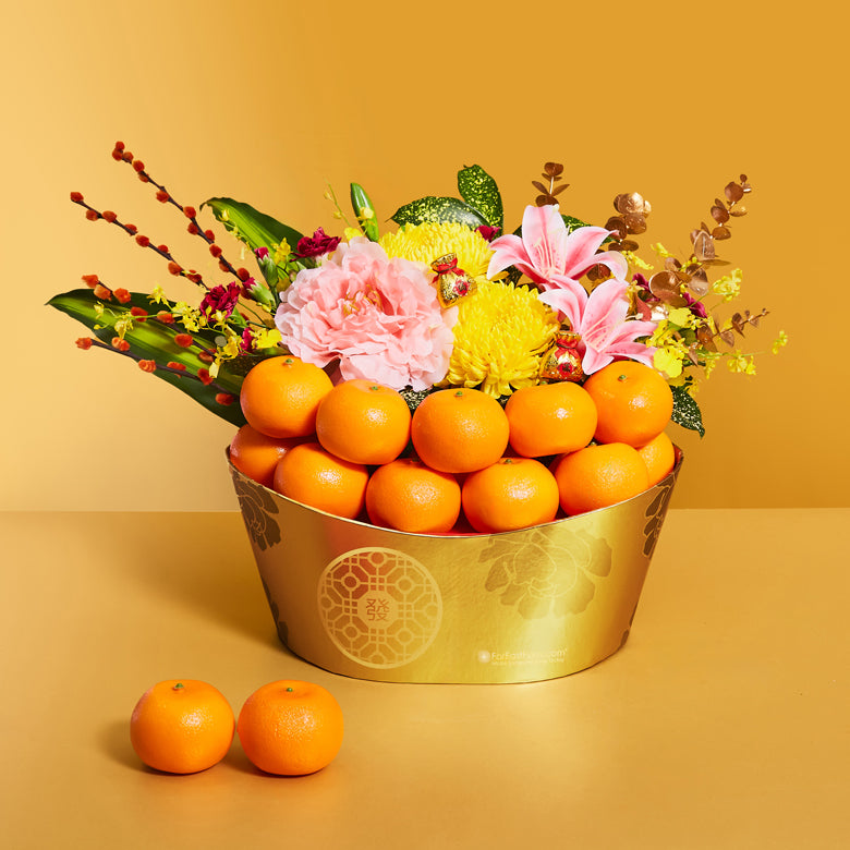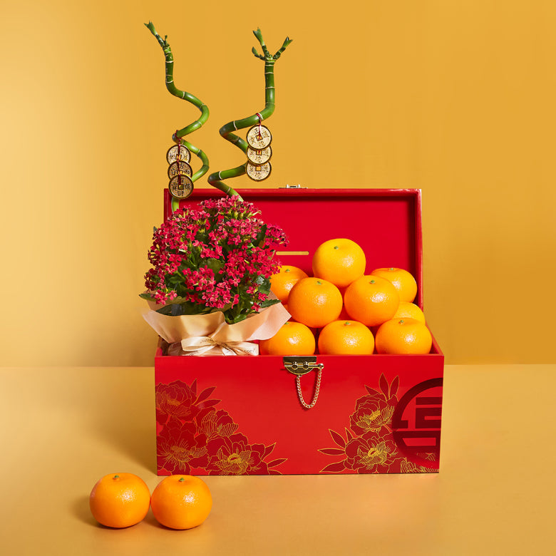 Symbolizing wealth and good luck, our oranges hamper brings you a harmonious blend of fresh oranges, festive blooms and snacks. This elegant gift embodies the essence of Chinese New Year blessings, making it a perfect gesture for prosperity and happiness.