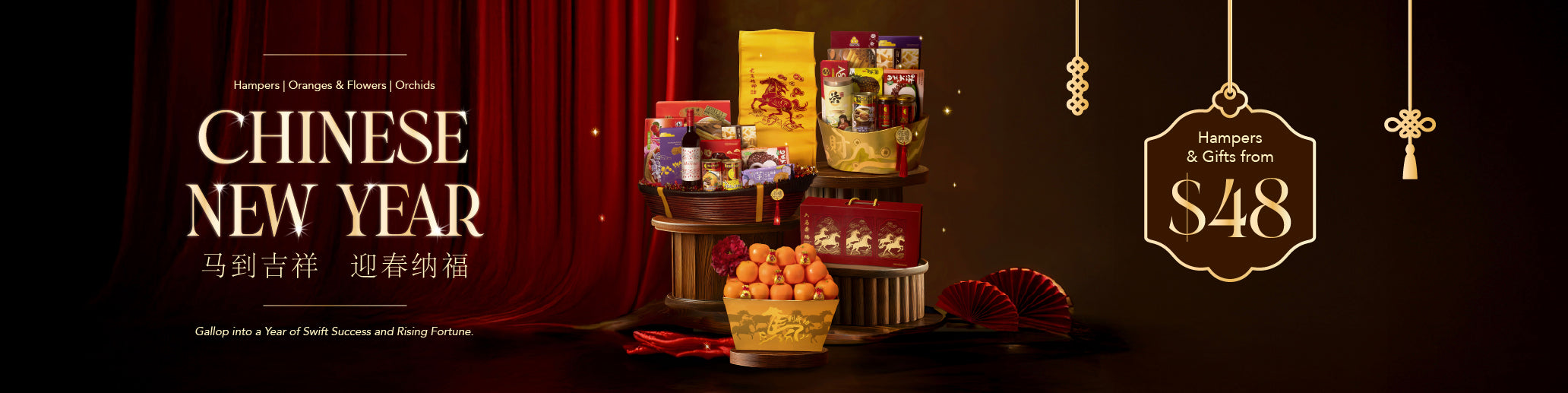 Presented in golden containers adorned with galloping horses, these hampers celebrate abundance, triumphant breakthroughs and a vibrant surge of New Year prosperity.